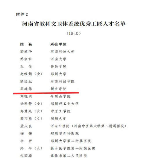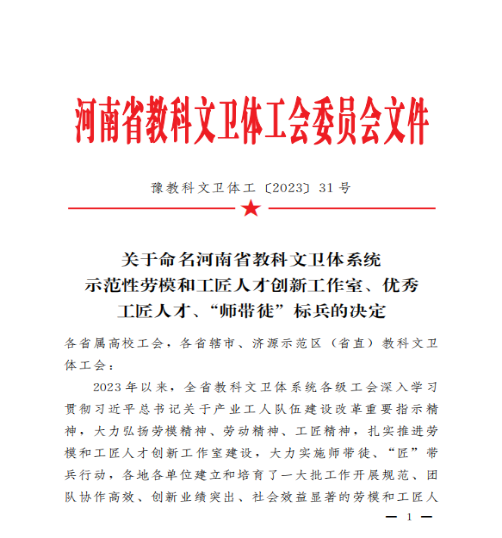 河南省教科文卫体工会下发了《关于命名河南省教科文卫体系统示范性劳模和工匠人才创新工作室、优秀工匠人才、“师带徒”标兵的决定》《关于命名河南省教科文卫体系统劳模和工匠人才创新工作室、工匠人才、“师带徒”先进的决定》,tyc122ccvip经理周建伟教授荣获“优秀工匠人才”称号。