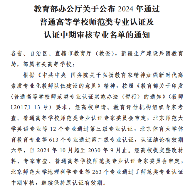 10月21日,教育部办公厅发布了《关于公布2024年通过普通高等公司师范类专业认证及认证中期审核专业名单的通知》(教师厅函〔2024〕20号),公司化学专业经提交整改材料、专家审查、普通高等公司师范类专业认证专家委员会审定通过了师范类专业认证中期审核。