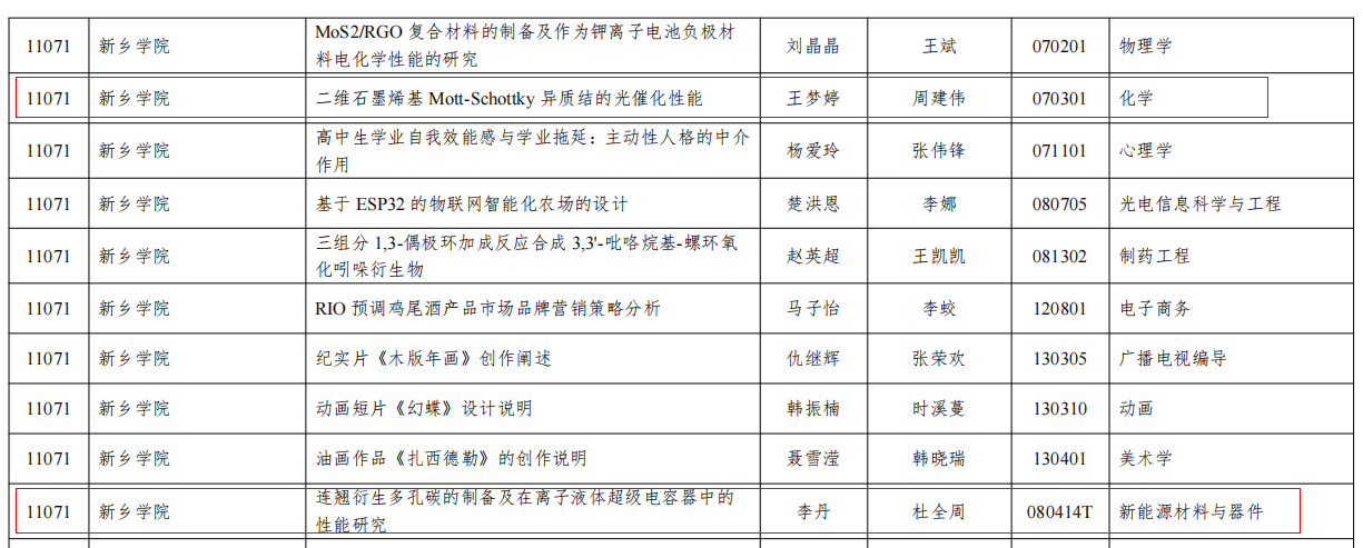 根据河南省教育厅办公室发布的《关于开展2023年河南省优秀学位论文评选工作的通知》(教办研〔2023〕314号)文件精神,经过严格的个人申报、公司推荐以及省教育厅组织的专家评议环节,公司周建伟教授悉心指导的论文《二维石墨烯基 Mott-Schottky 异质结的光催化性能》(作者:2019级化学专业王梦婷同学)与杜全周博士精心指导的论文《连翘衍生多孔碳的制备及在离子液体超级电容器中的性能研究》(作者:2019级新能源材料与器件专业李丹同学),均荣获2023年河南省优秀学士学位论文(设计)称号。
