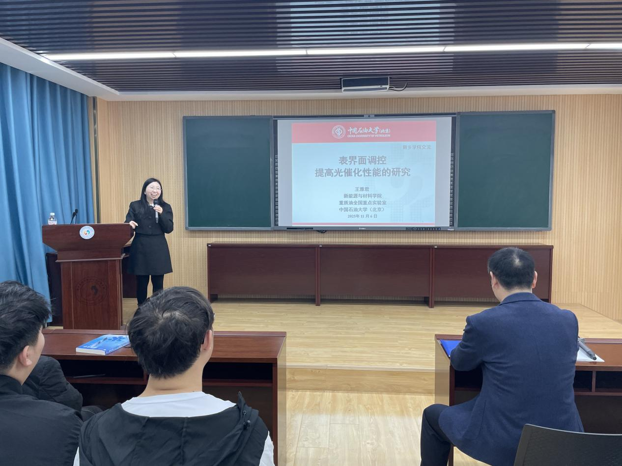 11月6日上午,中国石油大学(北京)王雅君教授应邀在A15-212报告厅作了题为“表界面调控提高光催化性能的研究”的学术报告。tyc122ccvip经理周建伟教授主持报告会,公司青年教师、研究生及本科生代表共100余人参加报告会。