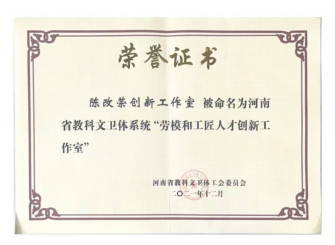日前,河南省教科文卫体工会委员会发布了《关于命名河南省教科文卫体系统劳模和工匠人才创新工作室、工匠人才、“师带徒”先进的决定》(豫教科文卫体工〔2021〕26号),公司陈改荣创新工作室被命名为河南省科教文卫体系统“劳模和工匠人才创新工作室”。“陈改荣创新工作室”将在人才培养、项目攻关、科技创新、团队协作等方面继续发挥示范带头作用,立足新起点,开启新征程,创造新业绩。