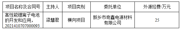 新乡市奇鑫电源材料有限公司委托公司梁慧君副教授攻关横向课题1项,项目经费25万元。