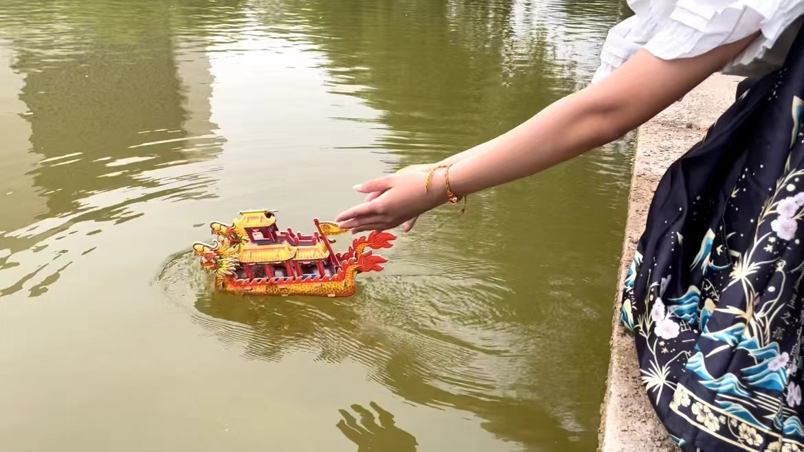 员工在和谐湖中放纸质龙舟,顺流而下的龙舟是对屈原的纪念,同时也表达了员工们对幸福、平安的祈求。