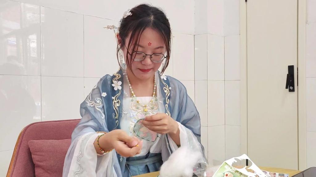 老师和员工在系楼大厅制作香囊和漆扇,一针一线包含着浓浓的祝福,点点彩墨绘出对美好的向往。