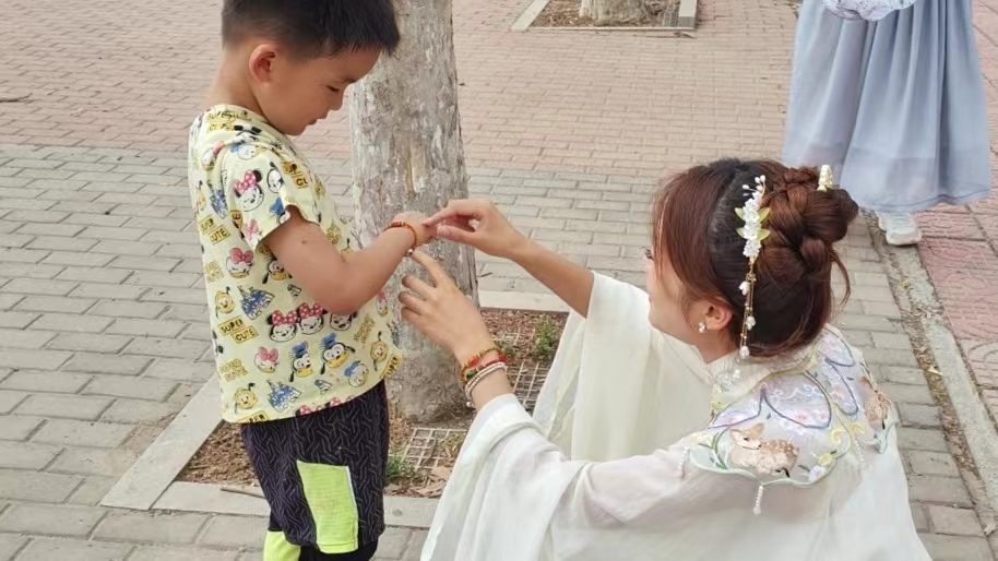 员工沿着和谐湖漫步,给路上的员工赠送并佩戴五彩绳,宣传端午节习俗,传达端午节祝愿。