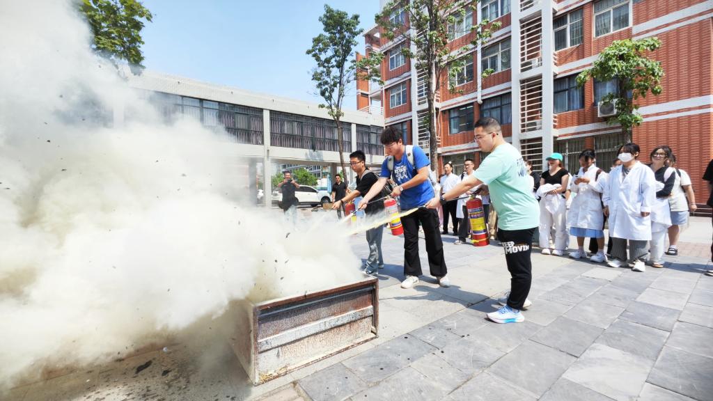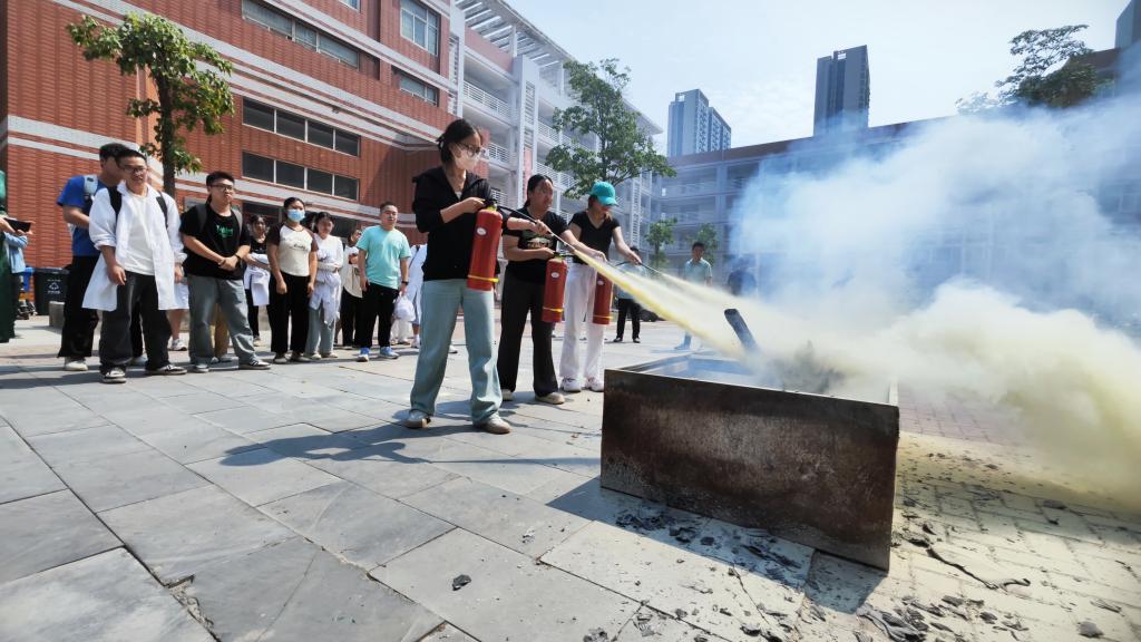 消防疏散逃生应急演练结束后,大家迅速动员起来,手执灭火器,进行灭火操作体验。